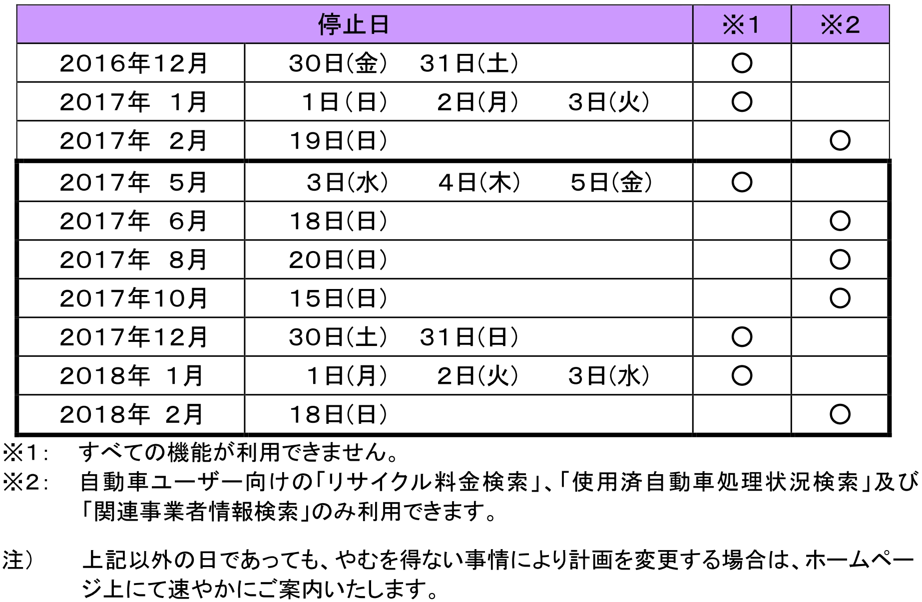 2017年度の自動車リサイクルシステムの稼働停止日のお知らせ